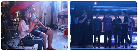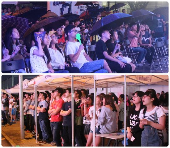 就在活动过半之时,天公不作美,下起了瓢泼大雨,观众席上同学们纷纷撑起了雨伞,而站着的同学们都躲进了主办方现场搭建的帐篷中;雨虽凉,但同学们热情高涨,这可把我们主持人海涛感动坏了,开玩笑说:“今天现场谁着凉生病了,请来找我报销医药费。”