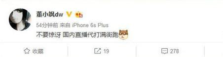 小编偶尔会看下董小飒直播,微博也关注了他。上一次董小飒对代打事件的表态,还是wolf发购买账号的微博时候,在wolf微博发出后,代打几乎已经成为了铁证,随后董小飒微博中说:“不要惊讶,国内代打满街跑!”