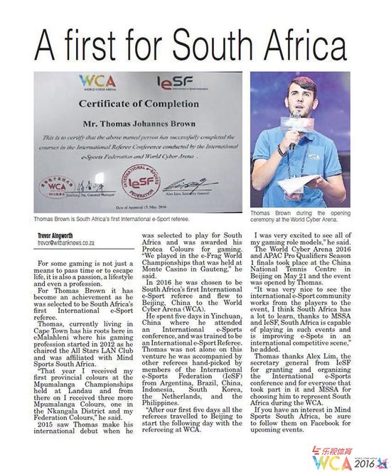 近日,担任WCA2016世界电子竞技大赛S1赛季线下总决赛裁判工作的南非知名电竞裁判员托马斯·布朗接受了南非媒体的采访。在采访中,托马斯讲述了参与WCA世界电子竞技大赛与国际电子竞技联盟(IeSF)合作创立的国家电子竞技大会的经历,以及出任WCA裁判工作的兴奋之情。