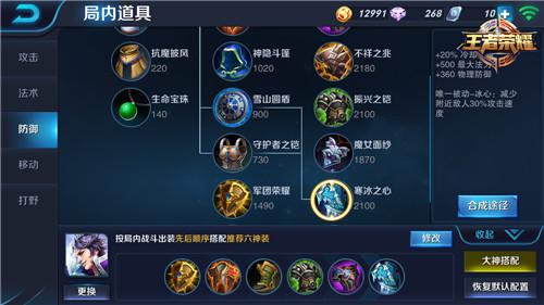 [寒冰之心]:+20%冷却缩减 +500最大法力值 +360物理防御 唯一被动—冰心:减少附近敌人30%攻击速度。