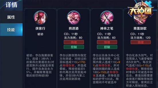 技能三-青莲剑歌:李白化身为剑气,飞速穿梭斩击5个随机目标,每次剑气造成物理伤害。释放技能时李白不可被选中和攻击。青莲剑歌需要由侠客行来解除封印状态,使用后立即进入限制状态