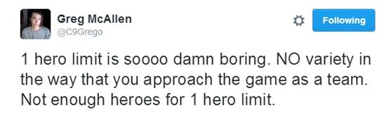 3. 英雄池太浅,不足以支持单英雄限制Grego还说道,守望先锋现在的英雄池还远不够支持单英雄限制。我前面也说了,各个战队根本无法在这种限制下开发出有趣的阵容和针对战术——这就是巧妇难无米之炊。在任何竞技游戏里,随着环境的演化总会有不同的核心、备用和鸡肋英雄,但在只有21个英雄的情况下我们实在是没有选择的余地。以目前的情况来说,这21个英雄里面有3个是必然会选的,还有3个往往也能入选,还有5个是几乎永远上不了场的。守望需要的英雄池肯定要远大于21这个数字,那样英雄分起层来才显得丰满,阵容组合才能丰富,单英雄限制才能健康、多元起来。