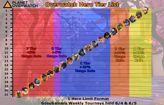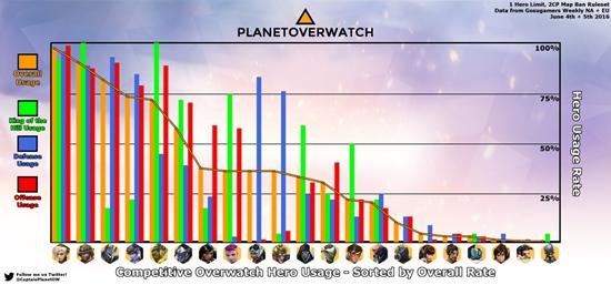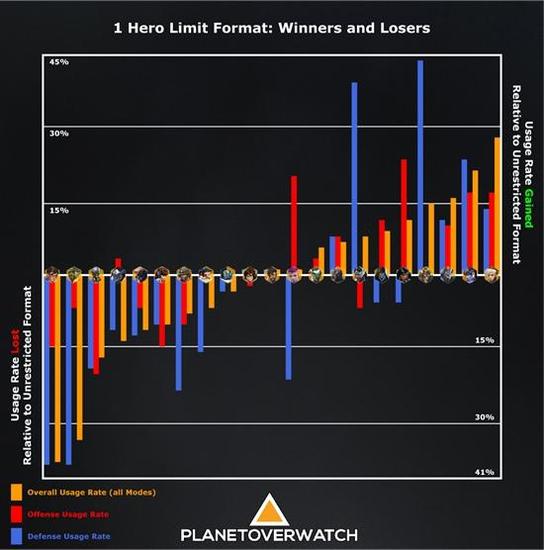 竞技比赛中守望英雄使用率总览引言大家好,我们是CaptainPlanet,为大家带来第13期守望英雄排行&环境报告,本期的重点是英雄限重赛制(不准重复英雄登场)。这周Gosu美服和欧服的周赛强势回归,两场决赛都突破了2万5千人的人气,完爆了同期举办的风暴英雄线下赛的人气数倍——这还是在目前世界最强战队C9缺席的情况下。如果你还怀疑守望的电竞潜力的话,以上这些已经足够说明问题了。最近,大家想必都注意到茄子的图标开始泛滥起来了,我也会提这个事。在成为烂大街的表情之前,茄子曾经在守望的电竞圈里有过重要的含义。针对肆虐封测时期的各种堆叠英雄衍生出的毒瘤现象,很多职业大神都发表过自己的看法,当时总结出的三条“净化守望”的结论直至今日还同样适用。这三条比赛规则分别是:禁所有纯抢点图、单英雄限制和使用真实秒表算小分。为了给这三条规则取一个名字,大家就用茄子来指代了。Gosu这次的周赛就用了茄子规则,而这也是本文的重点:职业大神得偿所愿后会怎样?这也是我们第一次专门针对单英雄限制的环境报告。