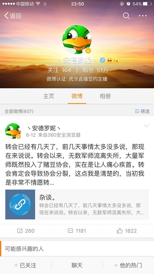 “转会已经有几天了,前几天事情太多没多说,那现在来说说。”安德罗妮微博的开头十分平淡,“转会肯定会导致协会分裂,这点我是清楚的,当初我是非常不情愿转会的。”他用平淡朴实的语言来描述了自己的心理历程,以求获得军师们的谅解,“不管怎么说,都是我造成的协会分裂,对不起军师们,请军师们有空的时候一定要来虎牙喷我,要不然我内心有愧。”