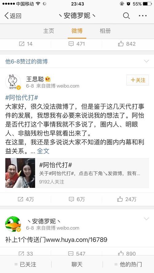 安德罗妮这次微博点赞,也是在表达自己拒绝代打事件,拒绝成为代打主播,并且公开表示自己也绝对不会支持代打的态度。而他从离开旧地投奔新东家的举动来看以及他后面发布的长微博内容看,对老东家容忍包庇阿怡代打这件事都有埋下伏笔。