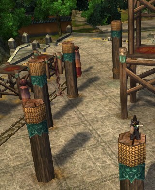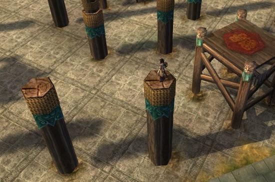 这里主要讲一下少林的梅花桩要怎么跳?这张图里我们能看到这块地方的全貌,我们的目标就是跳到中间的那个大台子上。