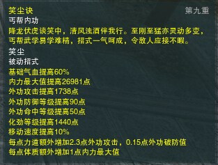 笑尘诀心法自带10%跑速,丐帮天生比别的门派腿长,同时丐帮有两个大位移技能: