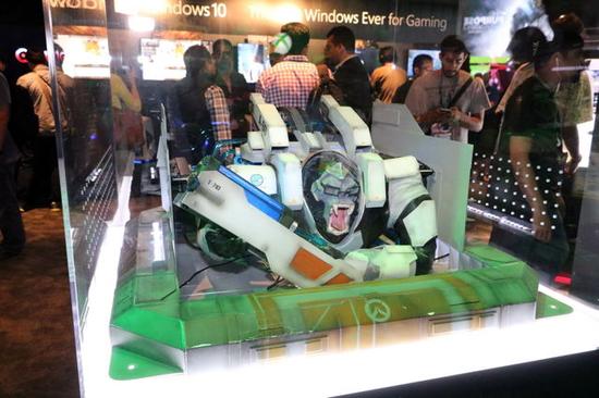 微软今日在摊位展出由‘PCJunkieMods(Lee Harrington )’所设计改装的两款电脑,第一款‘斗阵特攻’改装电脑是以《斗阵特攻》中知名英雄温斯顿为发想所设计,电脑除了结合温斯顿的造型外,内部采用 i7-6700K 中央处理器、Gigabyte X99-G1 Gaming 主机板、32GB DDR4 记忆体、400GB SSD 硬碟,与 Titan X 显示卡,醒目外型吸引不少参观者拍照。