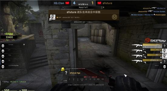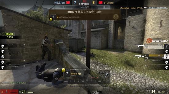 HG.Clan开局上来做CT是打了一波4比0的小高潮,而efuture是在第四分长枪局打出了优势,连扳两局将对手打入ECO。这张图上一些狭小空间让喷子起到奇效,efuture连追5分将比分反超,耿直打B,被偷到两个侧身,在第十分被HG打破僵局。