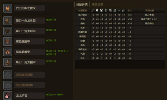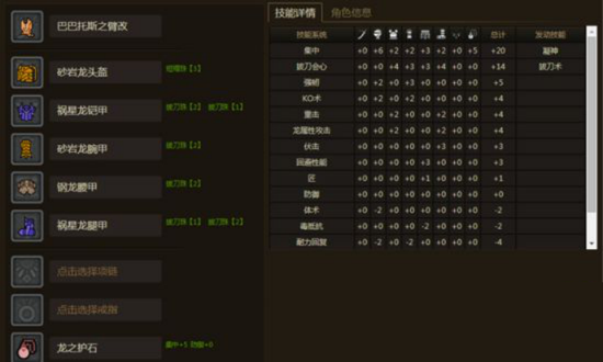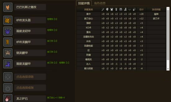 发动技能为拔刀极+攻击小+弱点特效,相信玩大剑的几乎人人都有这么一套装备吧,这个装备有最省钱的2个升级方法,一是保留护石换部分装备,那么我们可以配出凝神+拔刀,配装如下图,