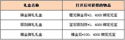 2016年6月13日更新维护后至6月16日24:00,全服等级≥15级的角色,可点击小地图下方的“皇朝御礼”按钮参与活动:购买限时铸金御礼礼盒、琢刻御礼礼盒、精金御礼礼盒,开启不同的礼盒后可获得对应的物品: