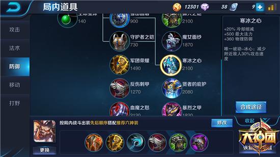 逆风局时可将冰霜法杖换成寒冰之心:增加生命和物理防御,缩减技能CD,减少附近敌人攻速。