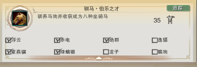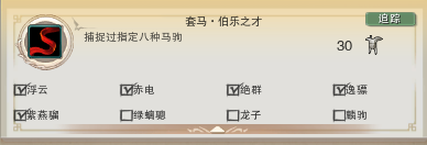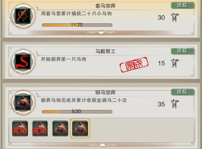 抓马的成就里面抓低等级的马是都可以在帮会领地里面抓获的,而高等级的比如龙子麟驹这样的,就需要大家进化成高级菜农之后再去抓取了。驯养的话,我们之前种的百脉根就派上了用场,驯马成就里有一个捐赠30匹马,推荐大家在帮会领地抓浮云马,三级,很容易养,养出来之后去找军需官捐赠,可以获得一个“盛唐魂”的称号,自产自销拿成就是不是很棒。
