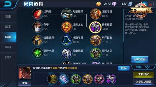 影忍之足:为吕布提供移速,并且增加防御能力。冰脉护手:对于吕布是非常合适的一件装备,由于它的被动是释放技能后下次普攻造成范围内减速,并且冷却时间和吕布一技能冷却时间非常接近。振兴之铠:这件装备可以提高吕布一技能回血效果。不祥之兆:这件装备的最大优点就是可以减少攻击者30%攻击速度与15%移动速度,因为当前版本最强势的刺客型英雄,宫本武藏,韩信,花木兰,还有一些ADC,这些都是比较吃攻速的英雄,所以这件装备可以限制这些英雄的输出能力。爆裂之甲的被动,受到攻击后可以增加移速和伤害输出的效果让吕布可以打出更多的伤害。霸者重装:这件装备当你打团击杀或者助攻的时候,可以在5秒内回复20%的血量,保证了吕布的生存空间。