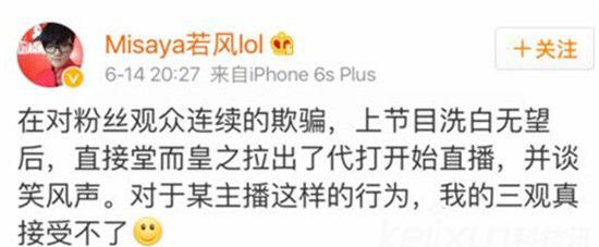 为此,若风发微博表示:在对粉丝观众连续的欺骗,上节目洗白无望后,直接堂而皇之拉出了代打开始直播,并谈笑风声。对于某主播这样的行为,我的三观真接受不了。