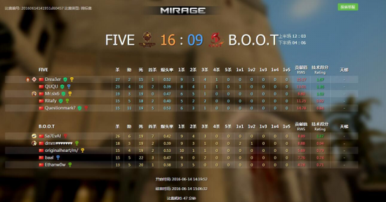 在第一张地图艰难拿下后,第二张MIRAGE图中B.O.O.T年轻的队员们对接下来面对5e的绝地反击没有太多的心理准备,导致自己选择的T上半场大比分落后,虽然后来及时调整心态,但是5e已经拿到赛点,在坚持了4局以后还是不敌Five-Esports,最终以09:16输掉第二场。