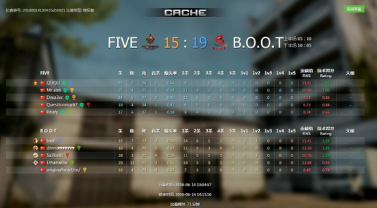 这次比赛中,B.O.O.T取得了万人瞩目的阶段性成果,从小组赛分组来看,B.O.O.T被分到D组,面对Five-Esports,B.O.O.T显得十分从容。在第一局CACHE上半场率先赢得10分,虽然下半场被反追进入加时赛,B.O.O.T也并未慌乱,稳住阵脚双方陷入拉锯战,最终B.O.O.T以熟练的战术预判经验未给对手任何翻盘机会以19:15拿下第一张图的胜利。