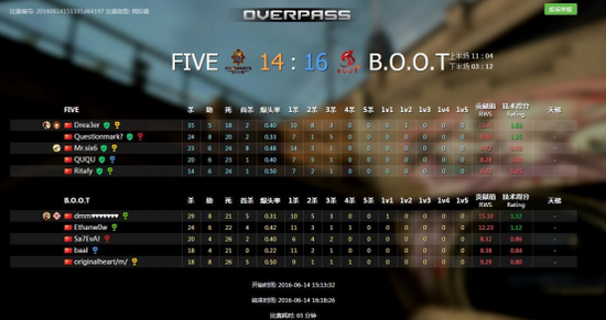 第三张图OVERPASS上半场Five-Esports占领了先机,开局领先了7分,4:11的比分并没有使队员们灰心,迅速调整状态找到突破口,直追了8个胜利回合,其中队员Originalheart/m/更是在比赛中打出了1V4的战绩,以16:14赢下决胜图,最终获得了整场比赛的胜利拿下了NEA(D组)线下资格权。