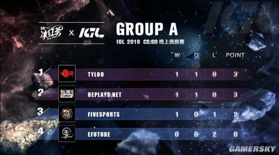IGL小组赛CSGO项目经过海选赛决出的8支队伍将与受邀的8支职业战队进行小组赛的争夺。A组的比赛于5月28日正式打响,A组的4支战队为:TyLoo、ReplaysNet、eFuture、F.I.V.E。