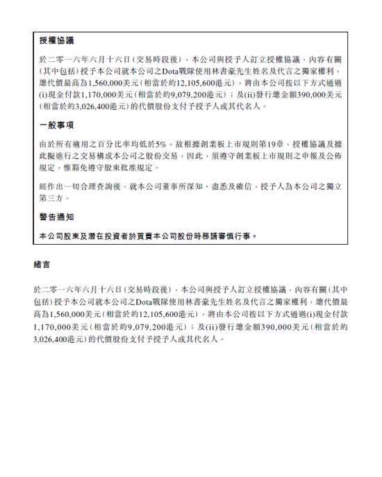 在协议中,中国数码文化以156万美金取得了林书豪姓名及独家代言的权利,其中117万美金通过现金支付,剩余39万美金以代价股份的方式支付。