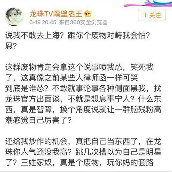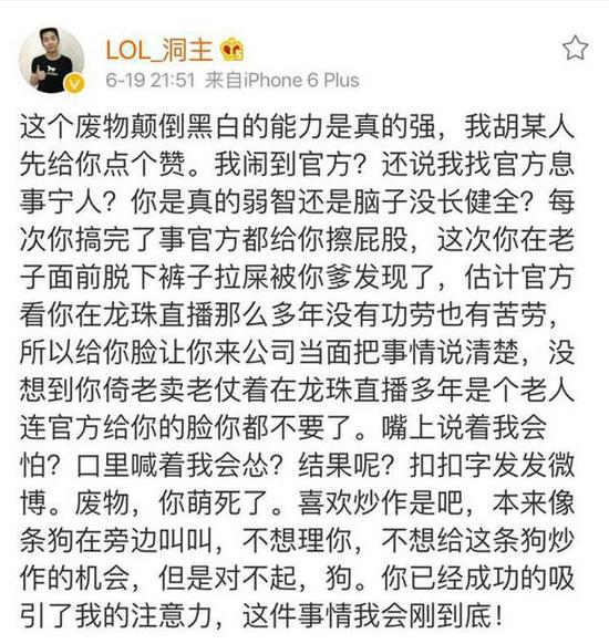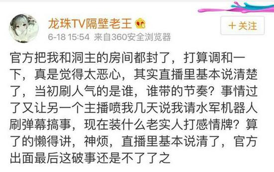 具体事件其实就是龙珠直播之前一次改版,改完版以后然后好多主播都没人气了。之后就有一个主播“隔壁老王”的人气特别高,然后老主播就不服气,有一位主播“LOL_洞主”跳出来说他买水军刷人气,然后对方不服,就开始撕逼了。