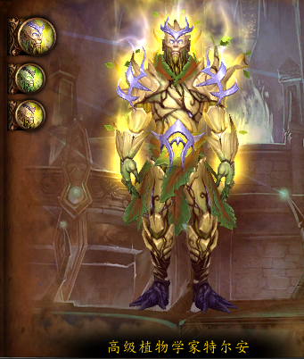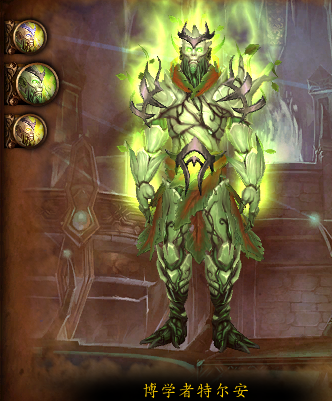 BOSS综述:[高级植物学家特尔安]会使用奥术、自然和日光魔法来保卫他的花园,他的剩余生命值到达75%和50%的时候,他会分离自己的能量,形成某个特定魔法系的强化形体,每个形体都会夺走他施放该系魔法的能力,但是会令那个形体获得新技能。