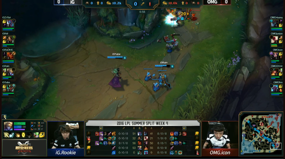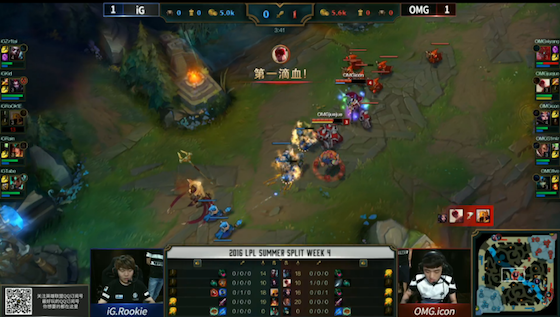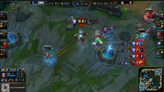 开局IG拿到爱希和韦鲁斯的双AD组合,两个手长的英雄在这场比赛中收获了非常好的反响,前期IG就利用手长的优势让OMG陷入了被动的局面。中期OMG偷偷的拿掉了大龙,但被迅速赶来的IG强势逼团。所以OMG并没有拿到什么优势。之后IG抓住时机中路逼团扳回一局。