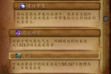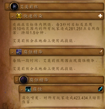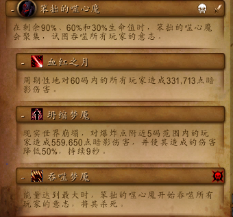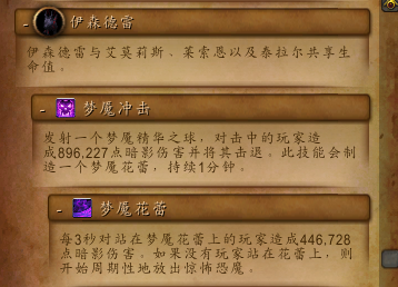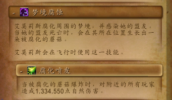 这个BOSS其实个人感觉挺简单的,一个流程性BOSS。战斗开始分别会有两条龙在地上,另外两条飞在天上,由于BOSS光环技能的关系,我们需要把地上的两条龙拉开60码以上,以免同时叠加光环。团队需要分为两队站在不同边来攻击BOSS。最开始我们是以3T来换嘲BOSS,这个打法需要全团移动,最后感觉压力很大。之后改为两T打法,只需要两个T移动相互换嘲BOSS,两边团员不需要移动。伊森德雷需要注意的技能是梦魇花蕾和被亵渎的幽灵这两个技能,前者需要一名玩家踩在花上,不然会不停的出小怪,但是踩在花上会受到伤害,所以需要治疗特别照顾。后者被亵渎的幽灵施放之前BOSS会先缠绕玩家,需要MS的大驱或者QS给自由来躲避接下来的亵渎喷发。这个技能个人认为是需要一些反应能力的,被亵渎喷发击中就是秒杀的。艾莫莉丝需要注意的技能是疾病传染和低吼,前者需要远离人群,后者是一个全场AOE+恐惧。视频中我们打的最好一次是把BOSS打进了所谓二阶段,一条龙飞天,天上的另一条龙飞下来。至于史诗模式下多出的那个怪,我们在场地上没有看见过,据说是出在传送门内,如果不击杀会全团秒杀。至于如何进传送门,视频中只看见在转阶段的时候,也就是BOSS70%血时,传送门会发光,应该是这个时候需要DPS和治疗进去击杀那只怪,可惜我们转阶段几乎就崩盘了,所以没见过那只怪。