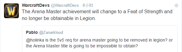 Q:在军团再临中,竞技场大师成就中对于5v5的要求会被移除么?还是说竞技场大师的头衔将无法再获得?