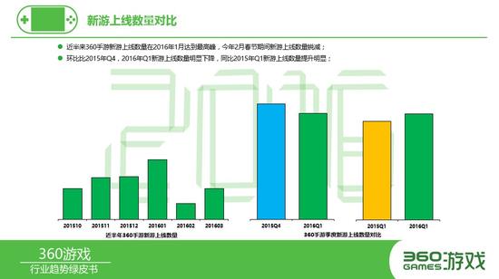 数据显示,360手游新游上线数量在2016年1月达到最高峰,今年2月春节期间新游上线数量锐减;环比比2015年Q4,2016年Q1新游上线数量明显下降,同比2015年Q1新游上线数量提升明显;其中动作游戏新游上线数量,2015年以来爆发式增长,2016年Q1较2015年Q1涨幅达136%。