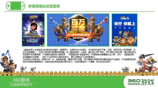 一季度大热游《皇室战争》上线前,就通过核心用户预约、预下载拉升转化率,在 PC端移动端精准投放大量推广资源、通过举办“《皇室战争》全球巅峰对决联赛”,吸引了众多民间大神前来参与,其作为竞技游戏的关注度随之爆发。而360游戏由“前置服务“、精细化用户运营、发行渠道升级等组成的精细化运营产业链,不仅能够保证游戏发行前期的数据表现,也能在游戏持续运营过程中发力,真正起到聚拢用户的效果。