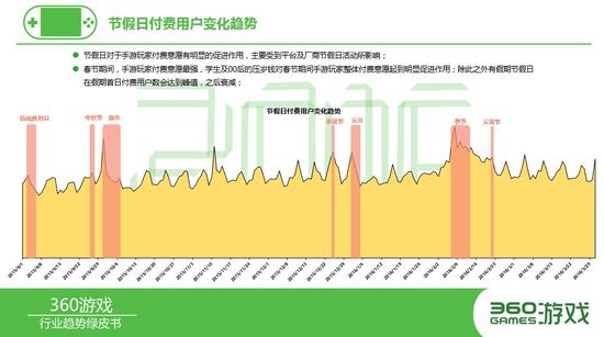 数据反应,节假日对于手游新增活跃有明显的促进作用,中秋、国庆、元旦、春节等“有假期节假日”对活跃新增的促进作用明显高于圣诞、元宵等“无假期节假日”,有假期节假日在假期首日付费用户数会达到峰值,之后衰减;Q1寒假期间,学生对活跃新增的促进作用凸显;而春节期间,手游玩家付费意愿最强;平日里,周四平台活跃用户最低,周五周六逐步增长,周六达到峰值。