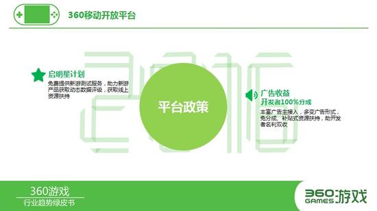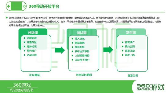 与此同时为了更好的扶持游戏开发商,360移动开放平台近期也推出“前置服务”帮助游戏CP顺利突围,原有的启星计划等诱人政策依旧不变。