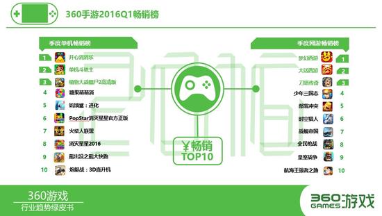 2016年第一季度360手游畅销榜TOP100中,有18%为单机游戏,81%为网络游戏;单机游戏中,躲避跑酷、消除游戏各占22%,其次为休闲益智游戏,占17%;网络游戏中,排名靠前的游戏依次为卡牌游戏、角色扮演、策略游戏、动作游戏;新游畅销榜TOP50的 游戏中,有86%游戏为网游,动作游戏达30%,其次为角色扮演游戏,达28%。