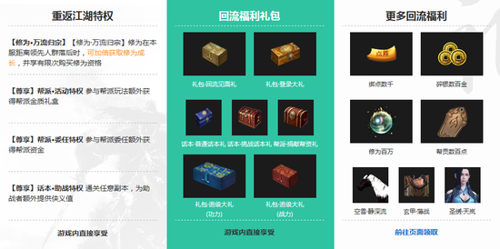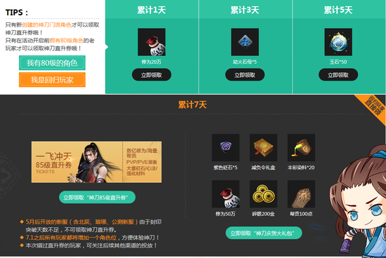 7月1日前连续7天及以上未登录的玩家,回归游戏,即可领取一飞冲天”神刀85级直升券和神刀庆贺大礼包!