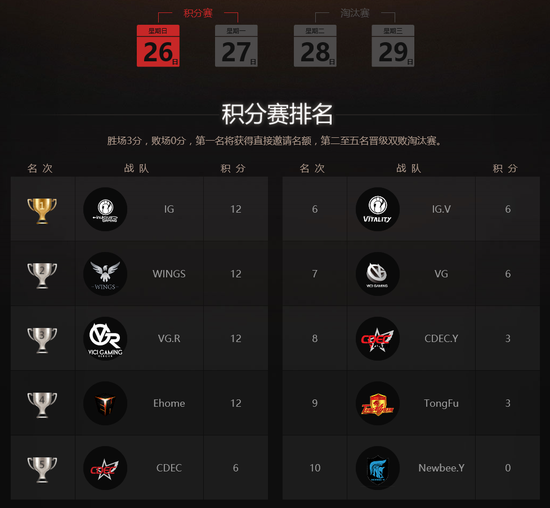 同样在预选赛首日发挥比较好的战队还有IG,WINGS和VG.R,截至到2016年6月26日晚21:20分。当前的积分排名如下: