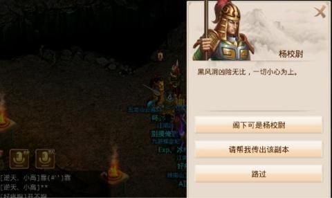 其次进入黑风洞是不是感觉阴森恐怖啊,这里你会遇见杨校尉哦,和他沟通几句了解一下黑风洞的情况,带领队伍开始寻找黑风洞的二当家,消灭二当家就要去找大当家了!这是第一层比较简单哦!(如图):
