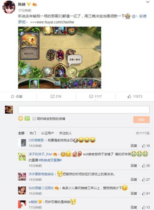 陈赫今天在微博上公开宣战安德罗妮,两个人的旷世对决也即将拉开帷幕。周三,天才陈赫携手四大战神对抗孤军奋战的安德罗妮大魔王!虎牙直播史无前例的炉石内战明日开战,绝对精彩,不容错过。