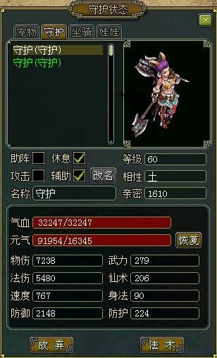 7、守护等级始终与其主人等级相同,升级时元气最大值发生变化,但当前元气值不变;