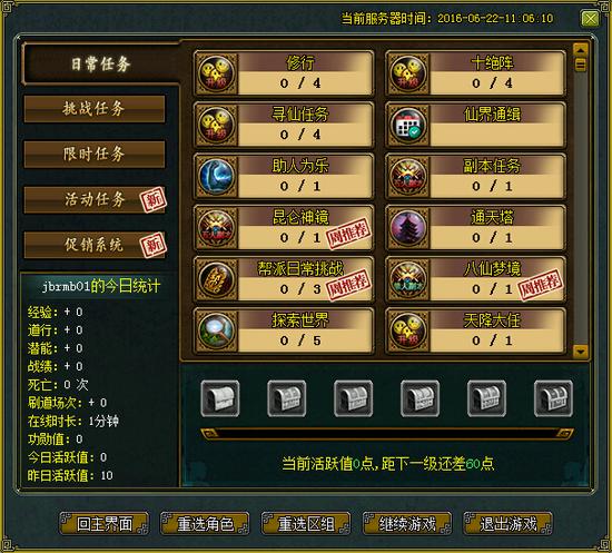 2、打开各任务分页可以查看当前可完成的任务种类和剩余完成次数等信息,当某任务该天可完成次数为0时,任务置灰,方便玩家浏览和区分;