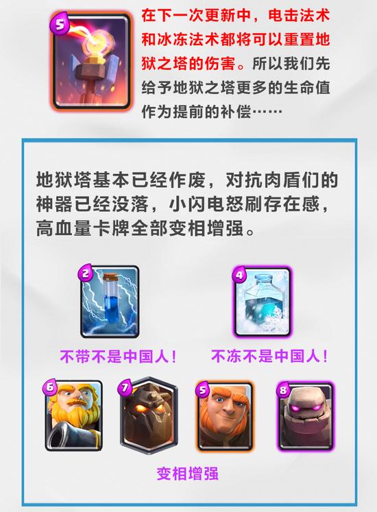 地狱塔:在下一次更新中,电击法术和冰冻法术都将可以重置地狱之塔的伤害。所以我们先给予地狱之塔更多的生命值作为提前的补偿……