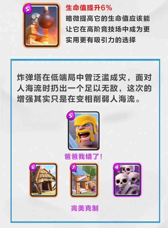 炸弹塔:生命值提升6%略微提高它的生命值应该能让它在高阶竞技场中成为更实用更有吸引力的选择