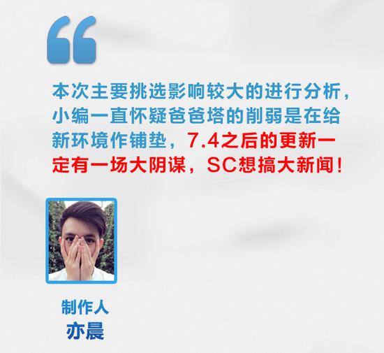 本次主要挑选影响较大的进行分析,小编一直怀疑爸爸塔的削弱是在给新环境作铺垫,7.4之后的更新一定有一场大阴谋,SC想搞大新闻!