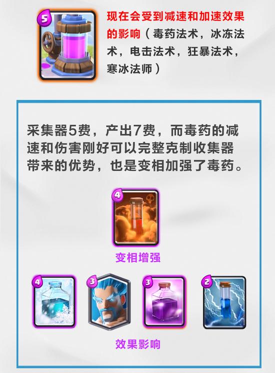 独家解读:采集器5费,产出7费,而毒药的减速和伤害刚好可以完整克制收集器带来的优势,也是变相加强了毒药。