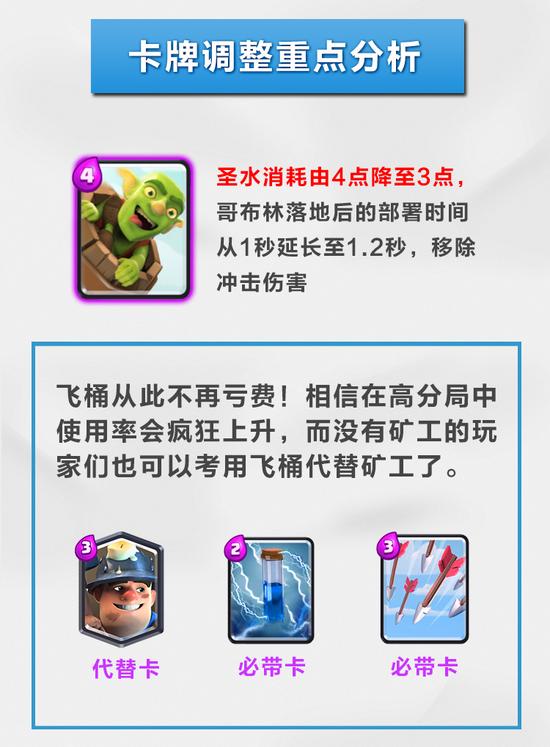 哥布林飞桶:圣水消耗由4点降至3点,哥布林落地后的部署时间从1秒延长至1.2秒,移除冲击伤害