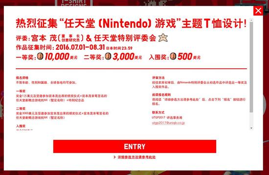 今天,任天堂宣布与优衣库联合举办全球任天堂游戏主题服装设计大赛,该活动征集时间为2016.7.1-8.13