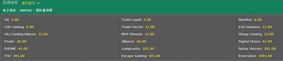 另一支中国队伍LGD虽然在春季赛表现一般,而且此后也没有参加ESL法兰克福的比赛,但是他们还是以9.0的赔率领跑第二梯队,这着实让人感到有些意外。前不久刚刚完成换血并成功杀出预选的EG和Secret两大魔王,他们的夺冠赔率仅为11.0,小编认为这样的赔率实在有点低看了这两支劲旅的实力。