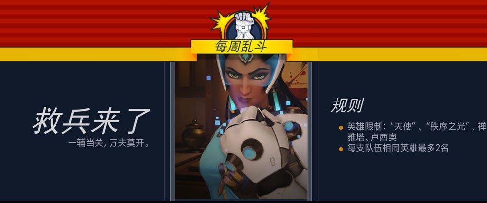 《守望先锋》本周的乱斗模式的主题是“救兵来了”,该模式的英雄限制为四位支援型英雄,也就是秩序之光、天使、卢西奥和禅亚塔,每支队伍相同的英雄最多2名。玩家们可以在来比比谁才是最强辅助了!