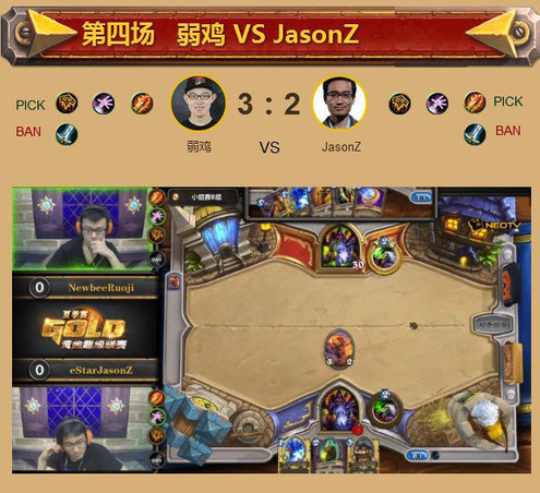 B组的第四场胜者组出线站由NewbeeRuoji 对阵 eStarJasonZ。前两局NewbeeRuoji和eStarJasonZ分别依靠各自的动物园都拿下了宝贵的一分,战成平手。而在第三局的萨满内战中,eStarJasonZ的打脸萨节奏更顺,很快就完成斩杀拿到赛点。然而eStarJasonZ并没能高兴太久,很快NewbeeRuoji就同样以2个无面投火者快速的还以颜色,双方战成2:2平。决胜局在两位选手的火妖法内战中展开,这一次NewbeeRuoji的手牌明显优于对手,很快就将eStarJasonZ的血线打入了安全线下。为求自保,eStarJasonZ不得不忍痛将法术进行解场,但最终还是没能等到尤格萨隆的返场。NewbeeRuoji再次以 3:2 击败了eStarJasonZ,成为B组第一个出线的选手。