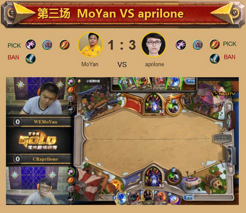 小组赛B组的第三场比赛在职业选手WEMoYan与民间大神CRaprilone之间进行。首局双方都选择了动物园出场,但今天的运气明显站在了CRaprilone一边,很快CRaprilone就奠定了站场优势,拿下首局。第二局,WEMoYan的超生德遇到了CRaprilone的克苏恩德。事实证明在小德内战中,谁先站场谁就能赢,强势压场的超生德很快就以一波咆哮带走了对手。在第三局的火妖法内战中,CRaprilone依靠古神尤格萨隆的出色发挥再下一局,拿到赛点。在最后一局的比赛中,CRaprilone的克苏恩德没有给对手太多机会,早早的放下了绝望之墙让WEMoYan完全无法应对。最终WEMoYan 1:3 不敌CRaprilone,成为了B组第一个被淘汰的选手。
